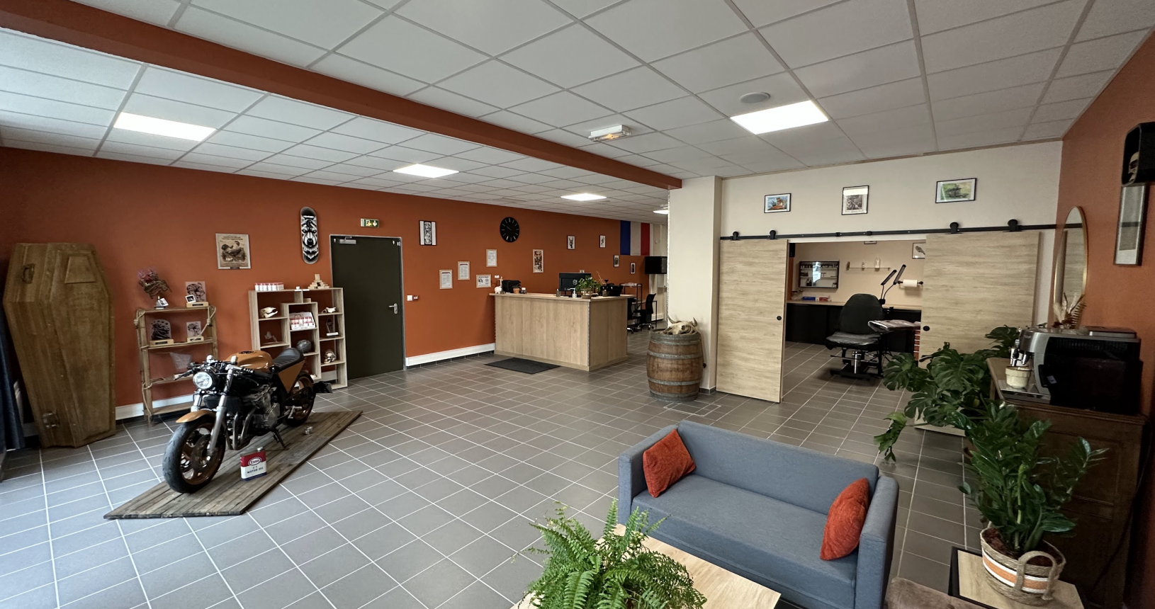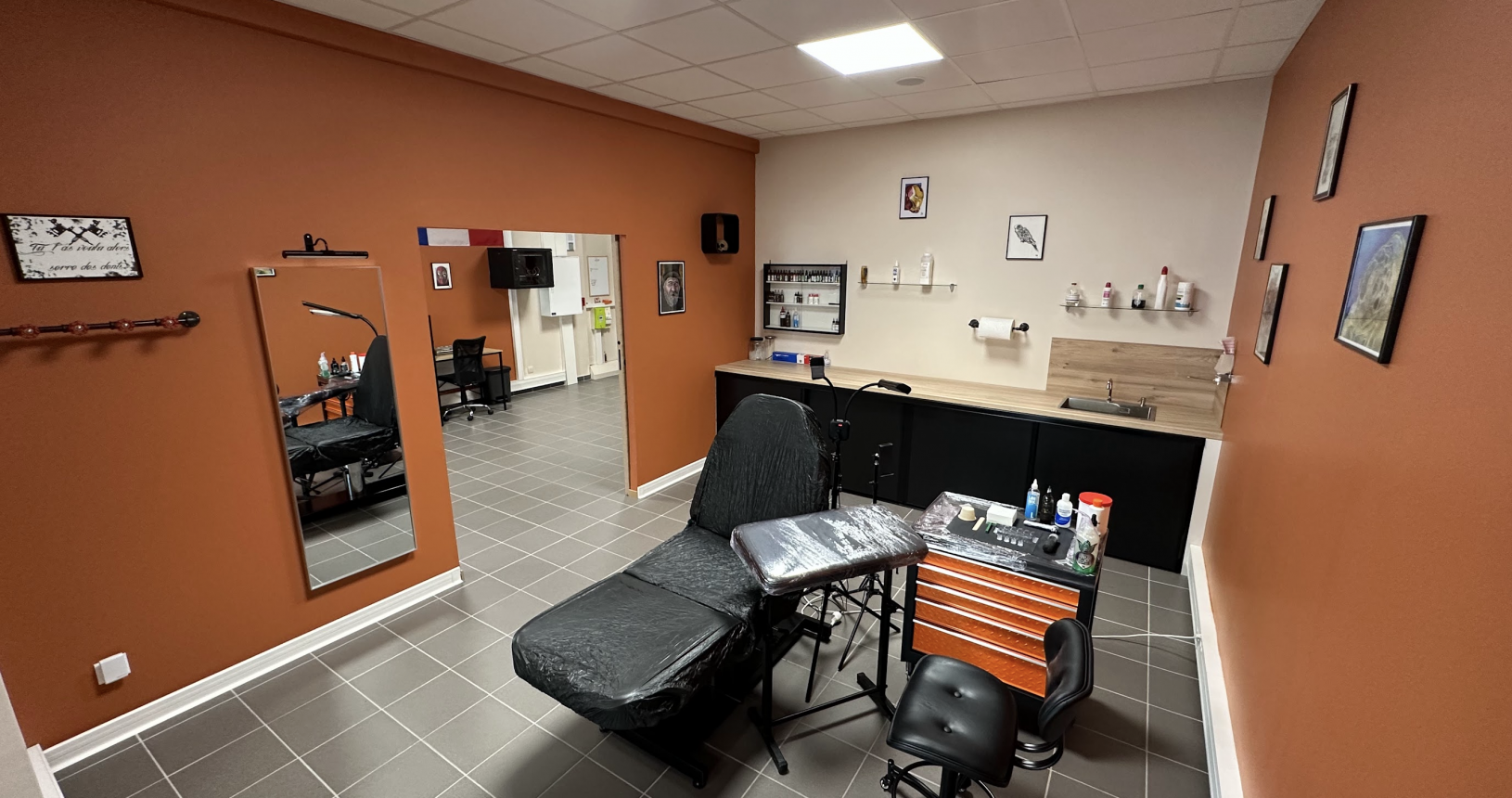 Le shop Transderm'Ink à été spécialement pensé pour vous accueillir dans les conditions d'hygiène les plus strict. Vous y trouverez un espace d'accueil avec de nombreux produits de soins post tattoo en vente mais également la pièce technique où les procédures de tatouage se déroulent.